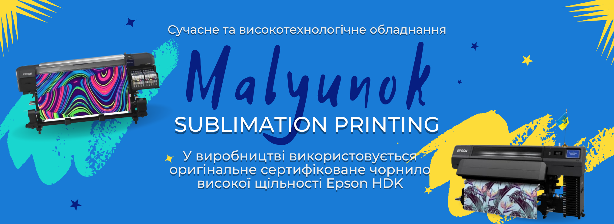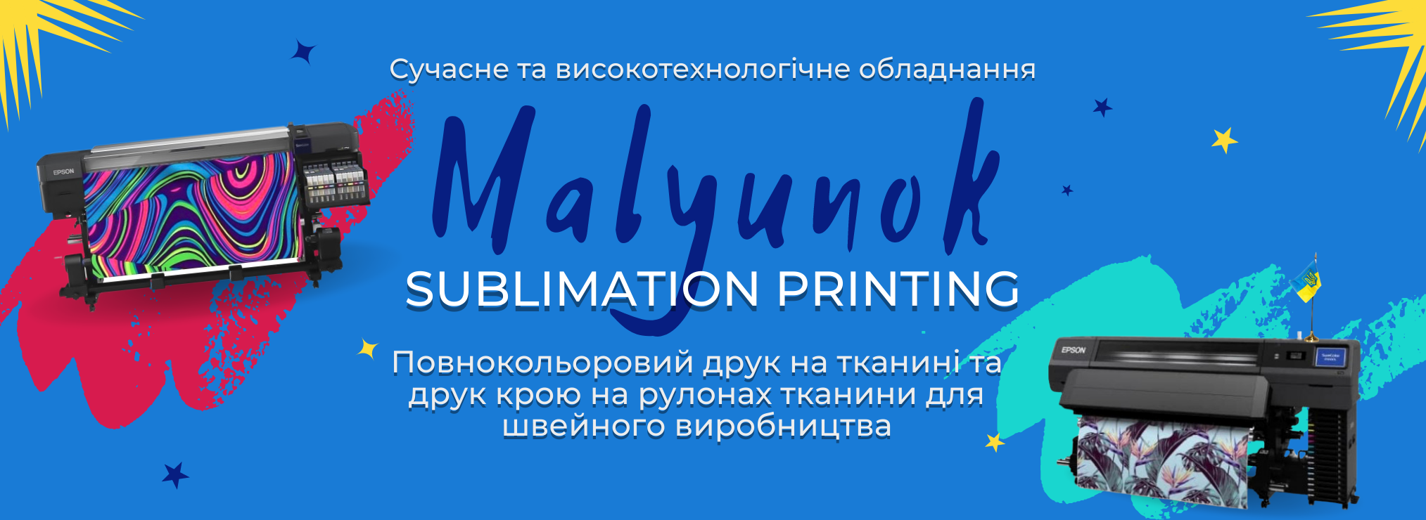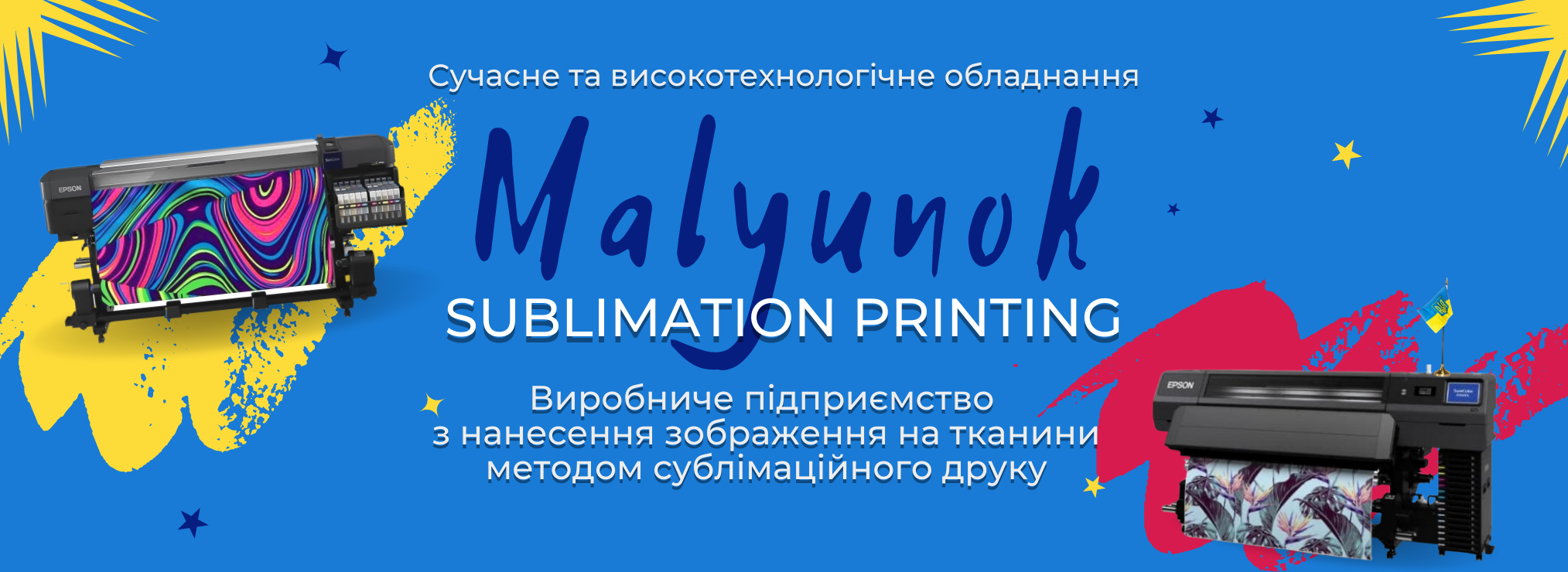 Компанія «Malyunok» - це виробниче підприємство з нанесення зображення на тканини методом сублімаційного друку (повнокольоровий друк на тканині та друк крою на рулонах тканини для швейного виробництва, виготовлення прапорів та декорацій, інтер'єрний та рекламний друк на тканині). Сучасне та високотехнологічне обладнання: принтери Epson SureColor SC–F 9400H, Epson SureColor SC–F 9400, Epson SureColor SC–F 7200, Epson SureColor SC–F 5010L, термопреси та масляний високопродуктивний каландр в сукупності з першокласними спеціалістами. у широкоформатному розмірі до 1,6м та запечатуванні рулонної тканини фотографічної якості.